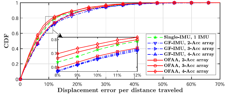 針對傳統(tǒng)方法存在的問題,本項工作創(chuàng)新性地提出了無角速度計算的加速度計陣列方案,在保證系統(tǒng)低功耗的同時,降低了系統(tǒng)的累積誤差。所提出的算法利用加速度計陣列內(nèi)的空間幾何約束,構(gòu)建軌跡重建優(yōu)化問題對最優(yōu)軌跡點(diǎn)進(jìn)行求解。本項工作求得了該優(yōu)化問題的閉式解,大大降低算法的計算復(fù)雜度。在實(shí)際二維場景的物理實(shí)驗中,與傳統(tǒng)的兩種方法相比,所提出的算法具有更高的軌跡重建精度、更低的功耗、更高的可擴(kuò)展性以及更強(qiáng)的魯棒性。這些結(jié)果表明所提方案相比傳統(tǒng)方案更符合新興應(yīng)用的需求,非常具有繼續(xù)深入研究的價值。圖1給出了本項工作的物理實(shí)驗平臺,圖2給出了各方案的軌跡重建誤差對比,圖3給出了各方案的累積誤差對比。