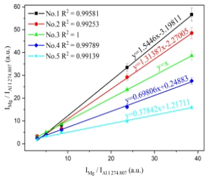 圖1. 未知樣品和標(biāo)準(zhǔn)樣品中分析元素歸一化譜線強(qiáng)度關(guān)系:(a) Mg;(b) Cr;(c) Cu;(d) Mn;(e) Zn.