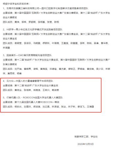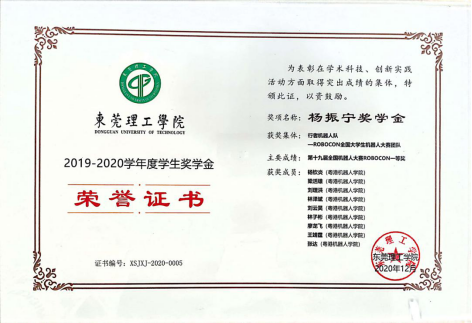 經(jīng)過材料評審、現(xiàn)場答辯等流程,由我院學生黃俊業(yè)主要負責的“見力儀——中國人的力量健康管理平臺項目團隊”以及我院比賽隊伍“行者機器人隊——ROBOCON全國大學生機器人大賽團隊”,成功在校內(nèi)各優(yōu)秀團隊中脫穎而出,榮獲“楊振寧獎學金”。