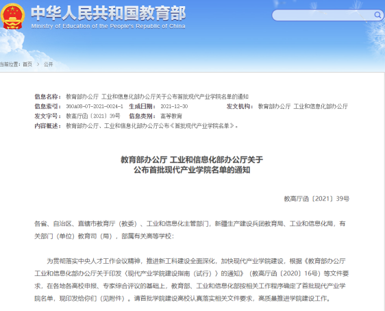 為扎實推進新工科建設(shè)再深化、再拓展、再突破、再出發(fā),協(xié)調(diào)推進新工科與新農(nóng)科、新醫(yī)科、新文科融合發(fā)展,全面提高人才培養(yǎng)能力。2020年,教育部、工業(yè)和信息化部頒布《現(xiàn)代產(chǎn)業(yè)學院建設(shè)指南(試行)》,并指出以區(qū)域產(chǎn)業(yè)發(fā)展急需為牽引,面向行業(yè)特色鮮明、與產(chǎn)業(yè)聯(lián)系緊密的高校,重點是應用型高校,建設(shè)一批現(xiàn)代產(chǎn)業(yè)學院。在此基礎(chǔ)上,引導高校瞄準與地方經(jīng)濟社會發(fā)展的結(jié)合點,不斷優(yōu)化專業(yè)結(jié)構(gòu)、增強辦學活力,探索產(chǎn)業(yè)鏈、創(chuàng)新鏈、教育鏈有效銜接機制,建立新型信息、人才、技術(shù)與物質(zhì)資源共享機制,完善產(chǎn)教融合協(xié)同育人機制,創(chuàng)新企業(yè)兼職教師評聘機制,構(gòu)建高等教育與產(chǎn)業(yè)集群聯(lián)動發(fā)展機制,打造一批融人才培養(yǎng)、科學研究、技術(shù)創(chuàng)新、企業(yè)服務、學生創(chuàng)業(yè)等功能于一體的示范性人才培養(yǎng)實體,為應用型高校建設(shè)提供可復制、可推廣的新模式。