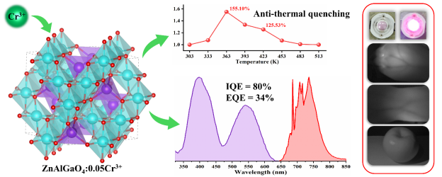 近紅外光在夜視、生物成像、監(jiān)測(cè)和檢測(cè)等新領(lǐng)域具有廣泛應(yīng)用,其中近紅外熒光轉(zhuǎn)換發(fā)光二極管被認(rèn)為是理想的光源選擇。作為熒光轉(zhuǎn)換發(fā)光二極管的核心組成部分,近紅外熒光粉必須具備高量子效率和良好的熱穩(wěn)定性才能實(shí)現(xiàn)最佳性能。然而,如何設(shè)計(jì)和制備同時(shí)滿足這兩項(xiàng)要求的熒光材料,仍是一個(gè)亟待解決的難題。本研究開發(fā)了一種新型的ZnAlB(1-x)GaxO4:Cr3+熒光材料體系,并隨著Ga逐步替換B,在x = 1時(shí)光致發(fā)光性能以及量子效率達(dá)到峰值效率。在進(jìn)一步的研究中,以ZnAlGaO4(ZAGO)為基質(zhì)變動(dòng)Cr3+的摻雜濃度(ZAGO:yCr3+)。系列中隨著Cr3+ 含量的增加,其半峰寬從32 nm 擴(kuò)展至 163 nm。這種現(xiàn)象被歸因于兩種Cr3+ 發(fā)射中心之間的能量轉(zhuǎn)移。特別是在這個(gè)系列中,ZAGO:0.05Cr3+表現(xiàn)出最為優(yōu)異的性能,其內(nèi)量子效率達(dá)到了80%,外量子效率為34%,并且擁有80 nm 的半峰寬。此外,該熒光材料展現(xiàn)了顯著的反溫度猝滅效應(yīng),在423 K的高溫下展示了125.53%的發(fā)光強(qiáng)度,其突出的熱穩(wěn)定性通過缺陷能級(jí)模型得到了闡釋。基于ZAGO:Cr3+熒光粉制備的近紅外熒光轉(zhuǎn)換發(fā)光二極管,在植物培育、夜視技術(shù)、無損檢測(cè)以及靜脈成像等多個(gè)領(lǐng)域展現(xiàn)了極大的應(yīng)用潛力。