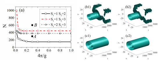 這篇文章研究了自由空間中李黃楊修正和平均場(chǎng)效應(yīng)共同作用下的量子液滴及其穩(wěn)定性。在該系統(tǒng)中發(fā)現(xiàn)了三種類型的量子液滴,一種屬于基態(tài),另外兩種屬于激發(fā)態(tài)。研究表明,隨著耦合相互作用強(qiáng)度的改變,激發(fā)態(tài)的半渦旋量子液滴在拓?fù)鋽?shù)大于1時(shí)可呈現(xiàn)鐘形或環(huán)形等兩種類型的量子液滴形態(tài)(圖1)。該研究首次發(fā)現(xiàn)攜帶8個(gè)拓?fù)浜傻母唠A半渦旋孤子仍可以穩(wěn)定存在。該論文還研究了雙渦旋量子液滴(兩個(gè)分量有不同的渦旋度)的存在性及穩(wěn)定性,并繪制了雙渦旋量子液滴的穩(wěn)定區(qū)域圖(圖2、圖3)。