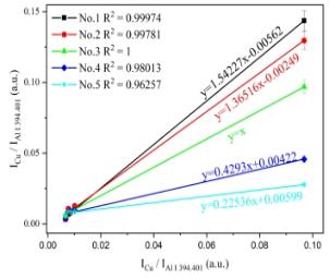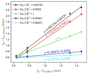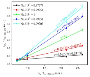 該文章研究了將飛秒激光剝離-火花誘導(dǎo)擊穿光譜技術(shù)(femtosecond laser-ablation spark-induced breakdown spectroscopy,fs-LA-SIBS)與單標(biāo)樣和多譜線定標(biāo)方法(One-point and multi-line calibration,OP-MLC)相結(jié)合,對(duì)鋁合金樣品中微量元素定量分析的可行性。該方法只需一個(gè)標(biāo)準(zhǔn)樣品即可對(duì)未知樣品元素進(jìn)行定量分析,它利用未知樣品與標(biāo)準(zhǔn)樣品中分析元素的多條特征譜線強(qiáng)度獲得線性擬合斜率,利用該斜率值和標(biāo)準(zhǔn)樣品元素含量值就可計(jì)算出未知樣品元素含量。該研究實(shí)現(xiàn)了對(duì)鋁合金中的微量元素Mg、Cr、Cu、Mn和Zn的定量分析,對(duì)此方法進(jìn)行了驗(yàn)證。結(jié)果如圖1和圖2所示,該方法可實(shí)現(xiàn)低含量元素的精準(zhǔn)定量分析,無需對(duì)所含元素含量的歸一化處理,不同元素分析結(jié)果互不影響;對(duì)5個(gè)鋁合金測(cè)試樣品中痕量元素Mg、Cr、Cu、Mn和Zn的定量分析平均相對(duì)誤差分別為6.4、28.1、21.9、19.0和20.0%。該方法為fs LA-SIBS技術(shù)進(jìn)行快速定量分析提供了便捷的方法。(文章鏈接:https://www.sciencedirect.com/science/article/pii/S0003267022011849?via%3Dihub)