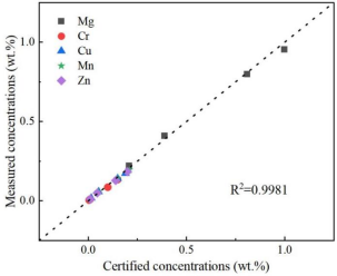 圖2. 在fs LA-SIBS中采用OP-MLC方法對(duì)Mg、Cr、Cu、Mn和Zn元素含量的預(yù)測(cè)結(jié)果與標(biāo)定值的比較。虛線表示探測(cè)含量和標(biāo)定含量的理想關(guān)系。