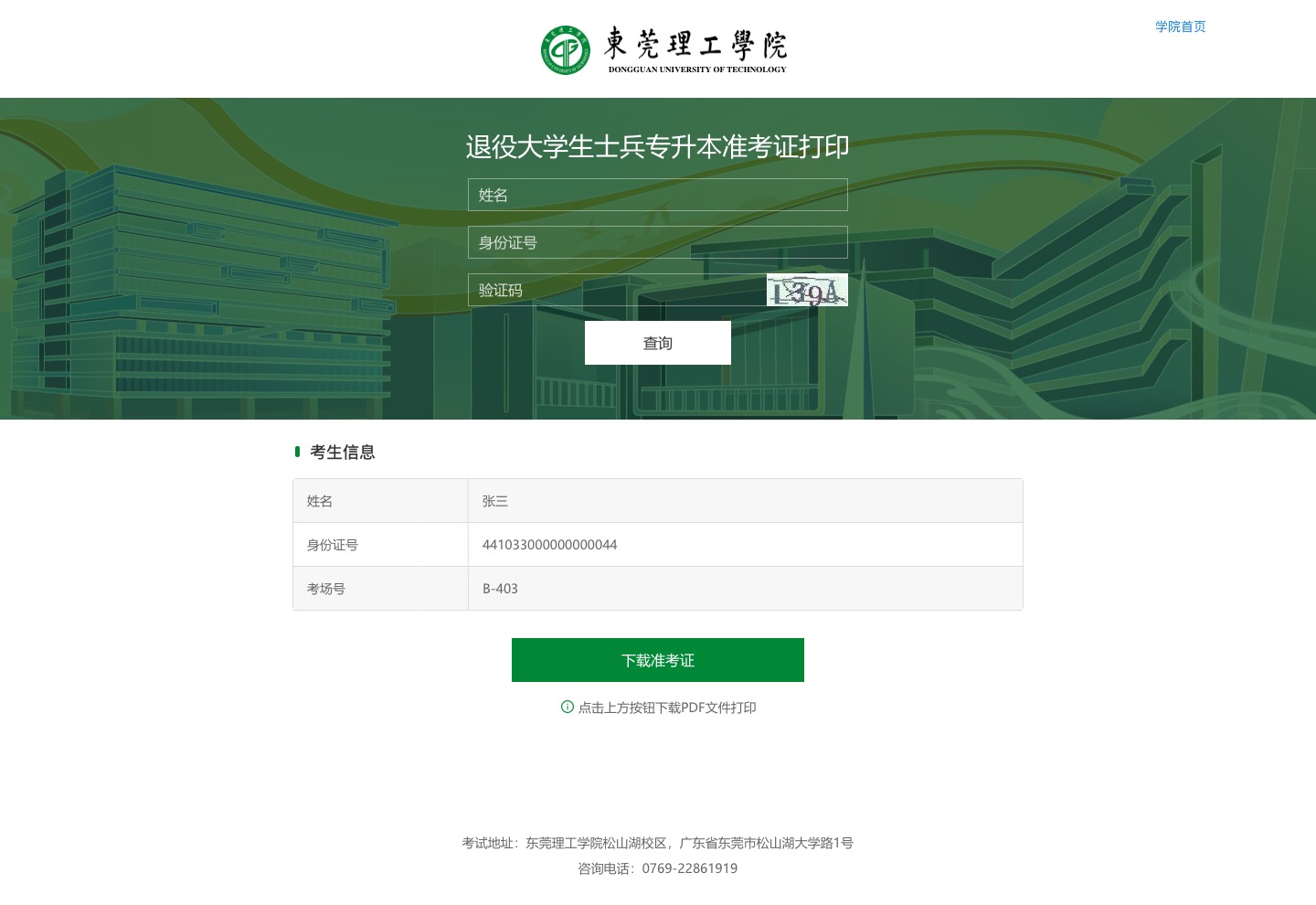 1.登錄“東莞理工學(xué)院招生信息網(wǎng)”https://zsb.dgut.edu.cn/,點(diǎn)擊“準(zhǔn)考證打印”。