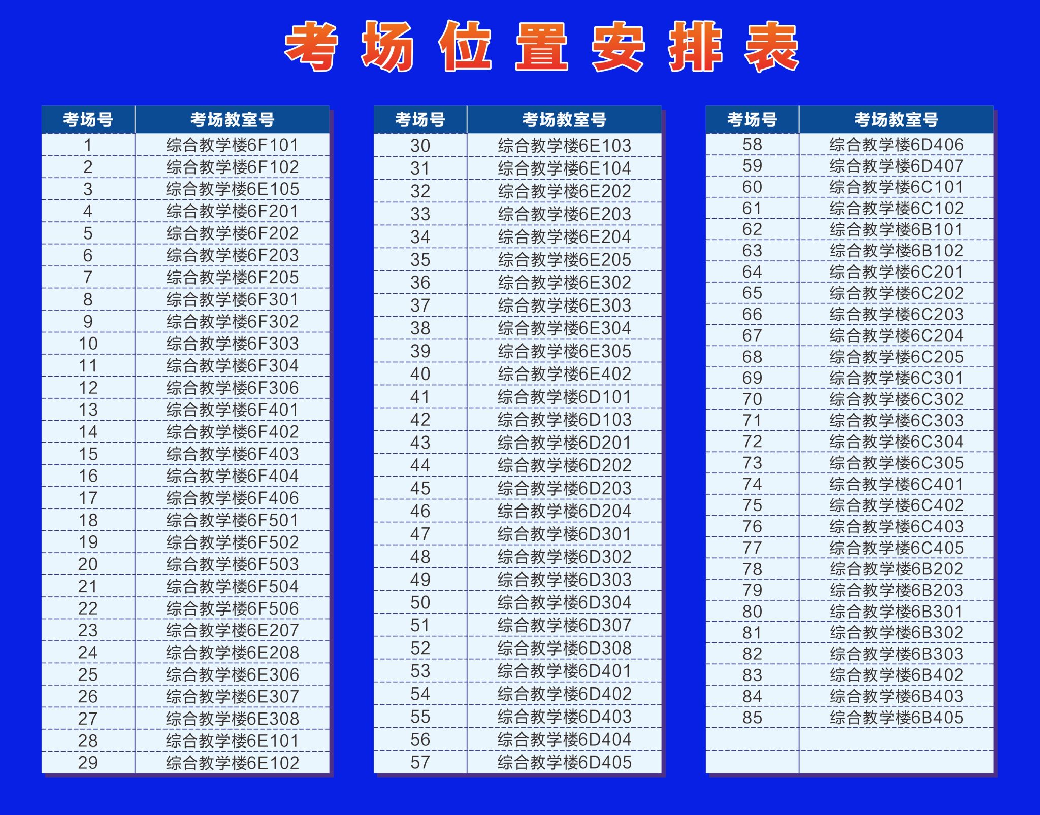 我校考點(diǎn)地址為廣東省東莞市松山湖大學(xué)路1號(hào),東莞理工學(xué)院(松山湖校區(qū))。考場安排在綜合教學(xué)樓6號(hào)樓6B-6F棟。具體考場安排表及考場分布示意圖詳見如下圖所示。