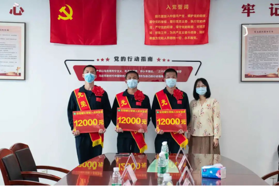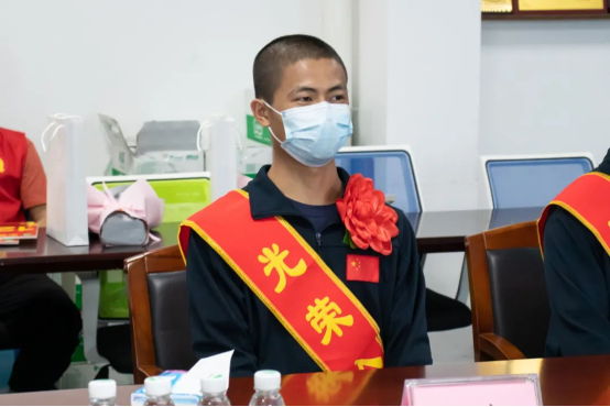 梁意紅為新兵頒發(fā)獎勵金并佩戴大紅花。班主任為新兵贈送學(xué)院紀(jì)念品。