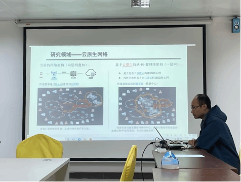 梁輝副教授首先對(duì)基于網(wǎng)絡(luò)孿生的新型智能網(wǎng)絡(luò)架構(gòu)技術(shù)與試驗(yàn)平臺(tái)項(xiàng)目進(jìn)行了總體介紹,闡述了當(dāng)前網(wǎng)絡(luò)架構(gòu)所存在的問(wèn)題,同時(shí)分析了未來(lái)基于云原生的感-傳-算一體化新型網(wǎng)絡(luò)架構(gòu)。隨后,針對(duì)該項(xiàng)目的核心問(wèn)題進(jìn)行了詳細(xì)講解,分別從體系架構(gòu)設(shè)計(jì)、資源管理調(diào)度與軟硬件實(shí)現(xiàn)三個(gè)方面展開(kāi),給出了具體技術(shù)實(shí)現(xiàn)細(xì)節(jié)。最后,與參會(huì)師生進(jìn)行了熱烈的討論,耐心細(xì)致地解答了大家的問(wèn)題。